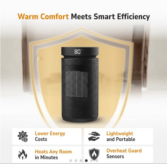 The brand markets it as a budget-friendly alternative to central heating systems, ideal for living rooms, bedrooms, offices, garages, dorms, and RVs.